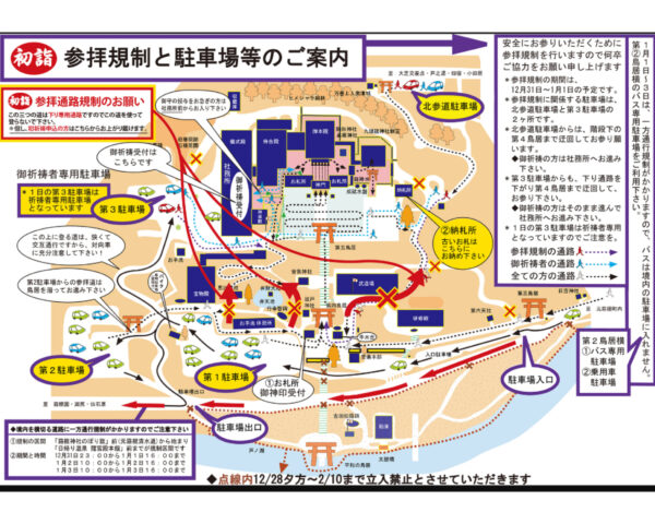 混雑時には参拝規制や交通規制があります。詳細は公式HPの総合案内図を確認してくださいね。