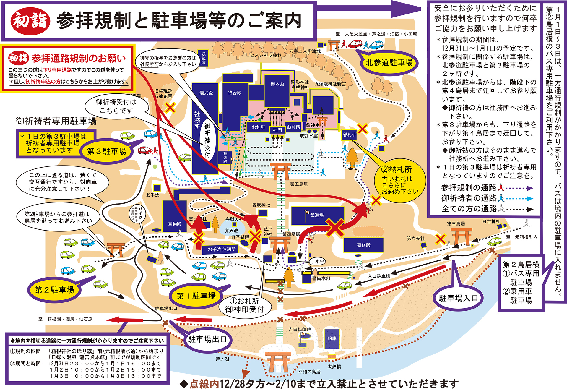 12月31日23時~1月1日16時までと1月2・3日の10時~16時は元箱根清水通り箱根神社ののぼりから、箱根園方面元レイクサイドアネックスまでの区間が一方通行になります。